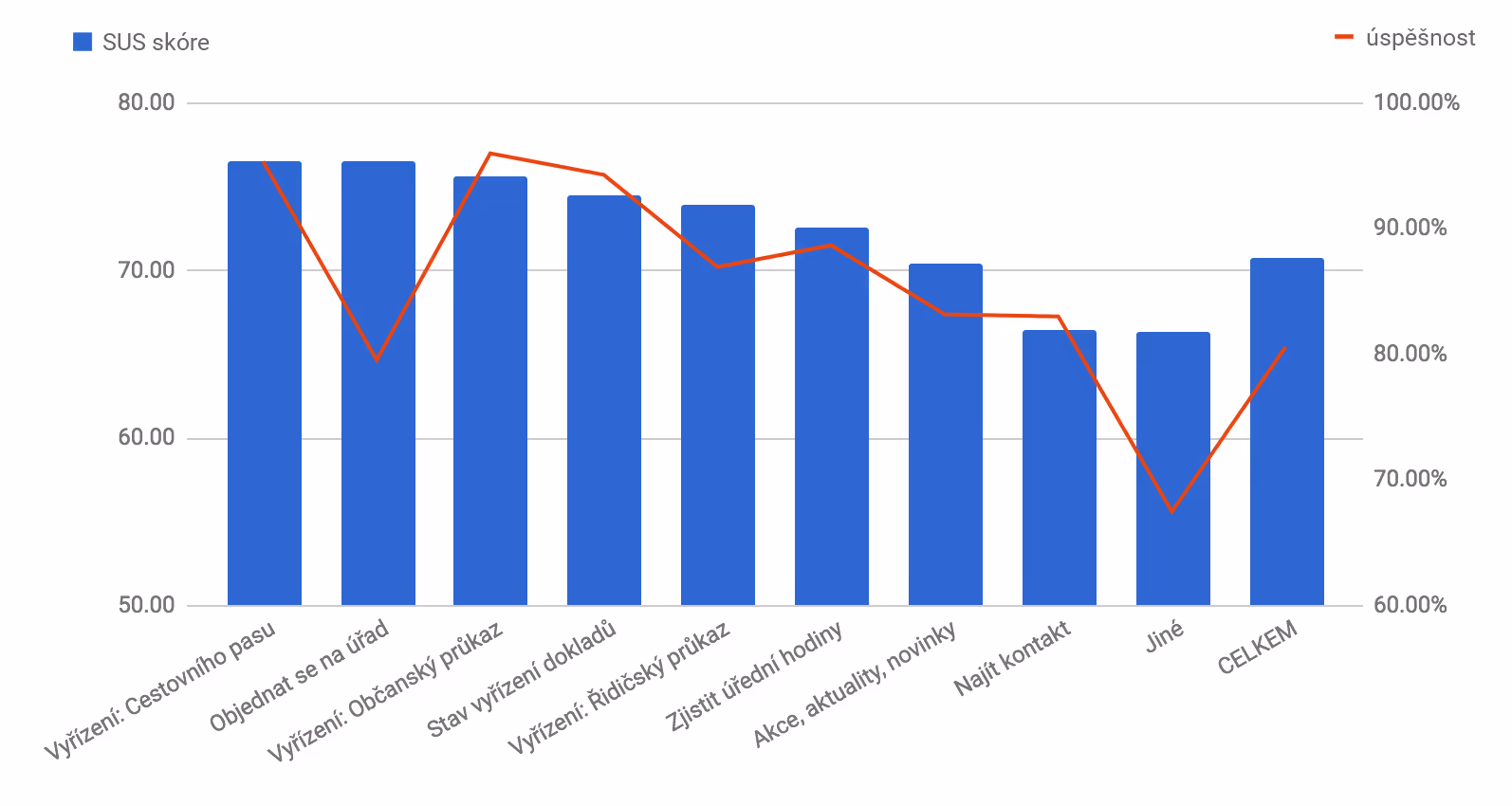 Náš původní předpoklad byl, že úspěšnost při plnění úkolů a spokojenost návštěvníků spolu budou korelovat. Ale zjistili jsme, že lidé jsou spokojeni, i když neuspěli. Proč? V případě hledání volných míst nebo objednávání se na úřad uživatelé uváděli, že nenašli vhodnou pozici, nebo termín. To je sice neúspěch, ale uživatelé stále hodnotí návštěvu webu kladně. Je tedy potřeba dobře vědět, co přesně daná metrika měří a jestli ukazuje na problémy s webem, nebo se službou samotnou.