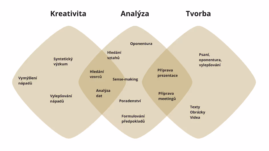 - Nástroje: Aplikace postavené nad modely. Je jich obrovské množství a stále exponenciálně přibývají. Nevažte se na dlouhou dobu dopředu na konkrétní nástroj. Možná příští týden vyjde jiný, řádově lepší. Plaťte si měsíční paušály, nikoliv roční.