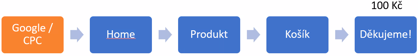 Problém s daty budou mít Google Analytics v tom, jak budou vyhodnocovány konverze jednotlivým zdrojům. Představme si situaci, že na web přijde uživatel z Google / CPC, projde 4 stránky, ve kterých na webu nakoupí. To může vypadat nyní nějak takto:
