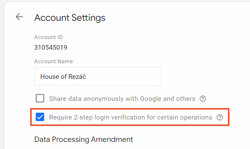V nastavení pracovního prostoru GTM, kde je umístěn měřící kód (v takzvaném kontejneru), také doporučujeme vyžadovat dvoufázové ověření „pro určité operace”. Pojistíte si tím potenciálně rizikové akce, jako jsou například změna uživatelského oprávnění či editace javascriptové značky a HTML značky.
