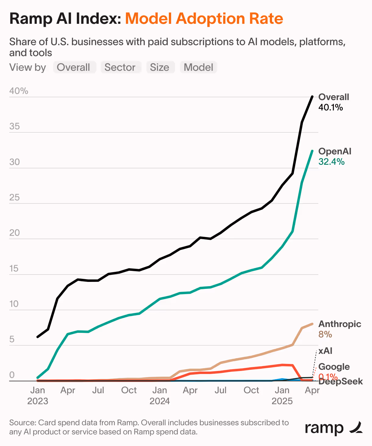 It's statistics Ramp Economics Lab says that 40% of American companies are paying for some of the generative AI models today.