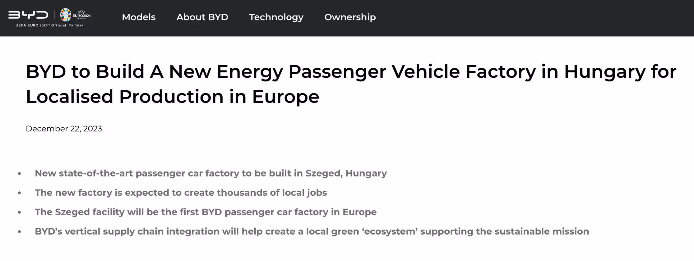 The next round will be directly in the EU. Tesla already has a Gigafactory in Germany. BYD is building a passenger EV factory in Hungary.